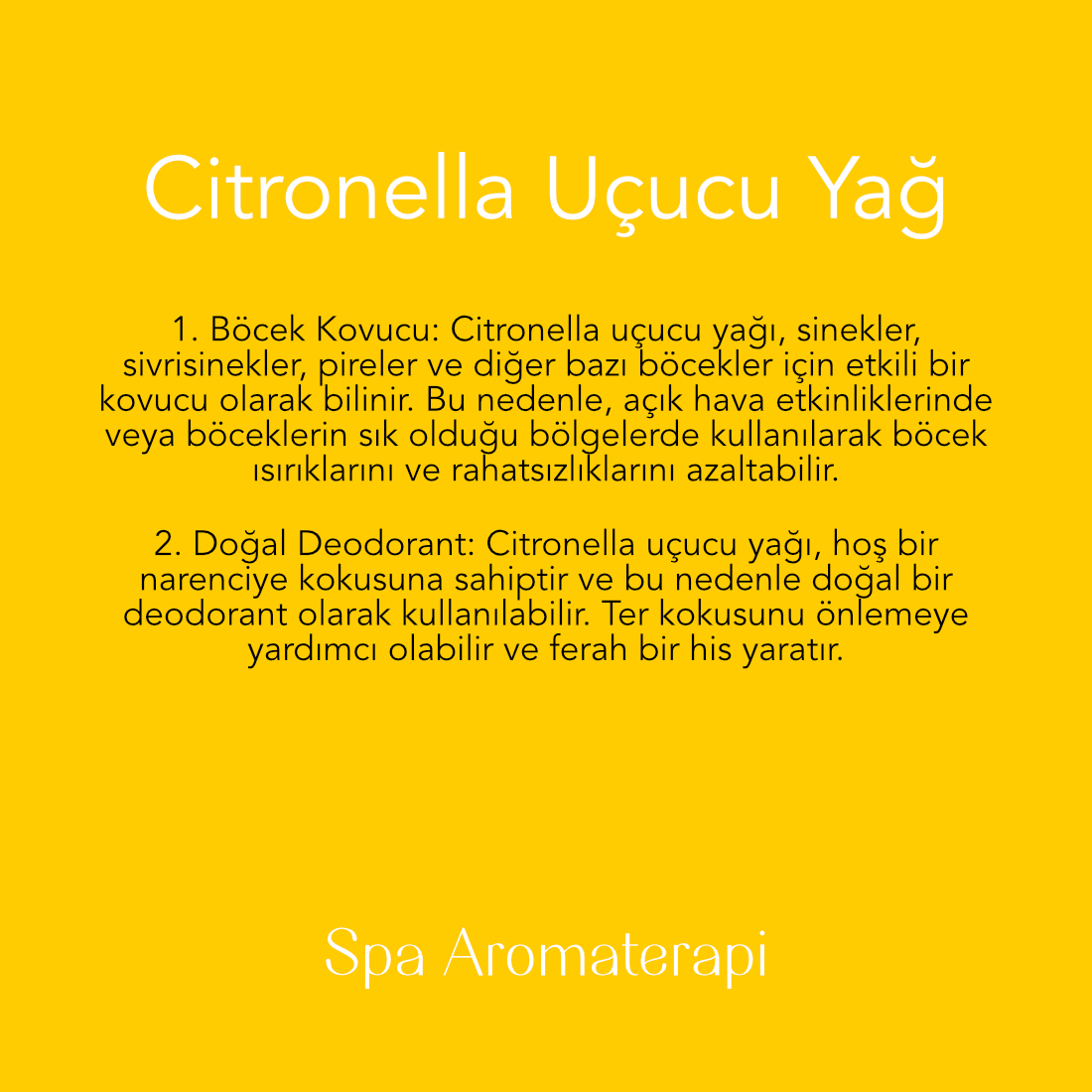 Citronella Uçucu Yağ : Citronella Uçucu Yağı, doğanın ferahlatıcı ve koruyucu gücünü şişede sunar. Özellikle sivrisinek ve böceklerden korunma konusunda etkili olan bu özel yağ, açık hava etkinliklerinde ve doğa yürüyüşlerinde güvenli bir seçenek sunar. Aromaterapide de sıkça kullanılan Citronella Uçucu Yağı, ferahlatıcı kokusuyla ruhunuzu canlandırır ve zihinsel berraklık sağlar.