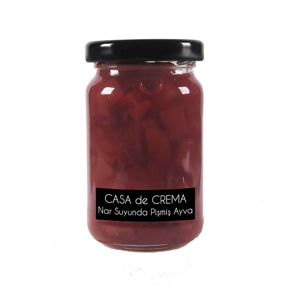 Casa de Crema Nar Suyunda Pişmiş Ayva: En özel ve en lezzetli ürünlerimizden biridir. Küp küp kesilmiş ayvaları, özel bakır kazanda sadece nar suyunda uzun saatler pişirerek elde ediyoruz. Taze nar suyunun muhteşem tadıyla pişirilen ayva, doğanın en lezzetli buluşmalarından birini sunuyor. İçeriğinde sadece en taze ve doğal malzemeler bulunan bu eşsiz lezzet, sağlıklı ve keyifli bir atıştırmalık arayanlar için ideal bir seçenek.Kahvaltılık olarak, pankelerinizde beraber ya da direkt olarak tüketebilirsiniz. Üzerine kaymak koyarak servis edebilirsiniz. Hiçbir katkı maddesi, koruyucu, pektin, kıvam arttırıcı ve yapay tatlandırıcı içermez.